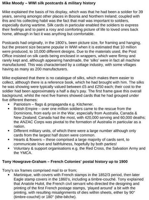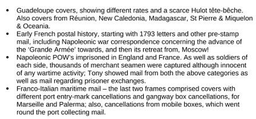 Unusually, despite there being a good attendance, there were only three presentations. However these were of excellent quality and interest and were keenly viewed and discussed in the interval, which divided the evening, with a most successful auction. This produced a record surplus for the year, which was due in considerable part to the much appreciated auctioning of a significant range of kindly donated philatelic books. There are still more to be auctioned!